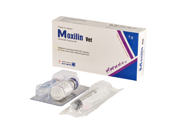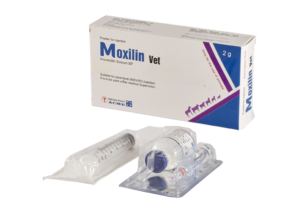 Moxilin Vet 1 g: Each box contains one vial powder for injection & one ampoule of 10 ml water for injection BP in a blister strip and a 10 ml disposable syringe.