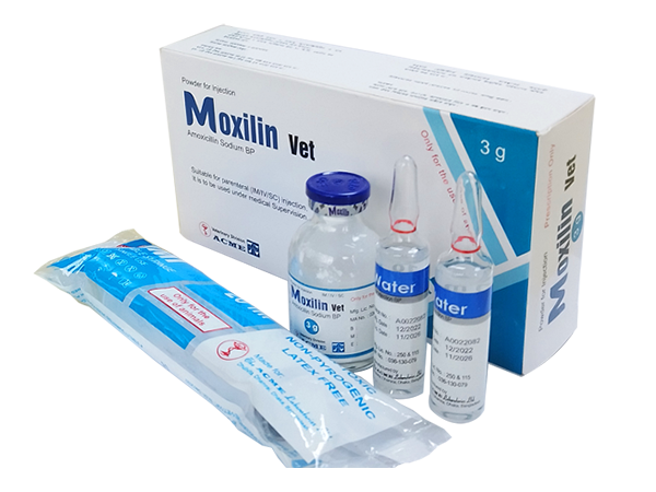 Moxilin Vet 3 g: Each box contains one vial powder for injection & two ampoules of 10 ml water for injection BP in a blister strip and a 20 ml disposable syringe.